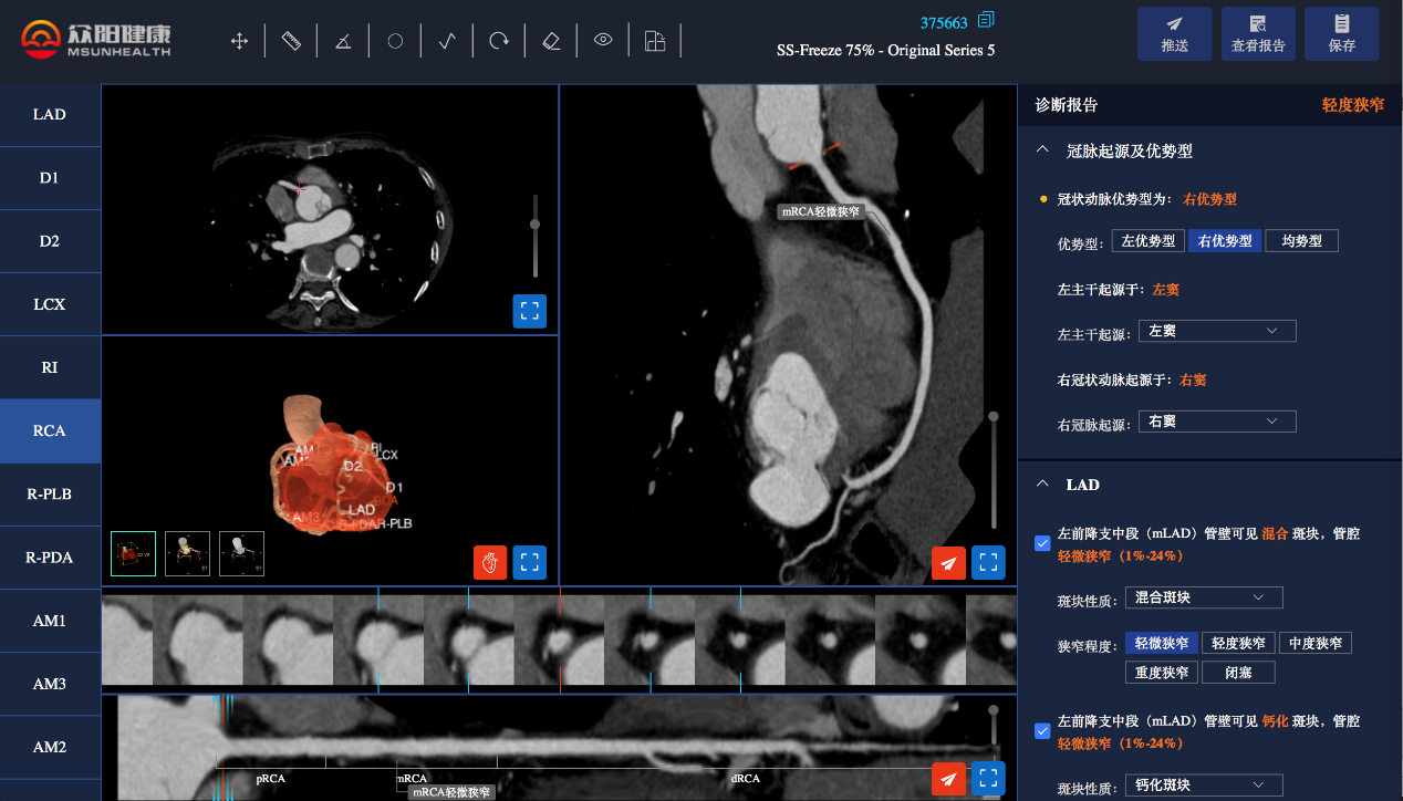 众阳健康冠脉CTA智能辅助诊断系统可快速完成冠脉血管增强CT 影像自动重建和后处理计算,一键获得准确的三维重建图像、精准的血管名称标记,便于医生全方位观察冠脉情况。还可辅助医生更快发现斑块、观察斑块形态、判断斑块性质,明确血管有无狭窄及狭窄程度等,大幅度提升了诊断效率和精确度。