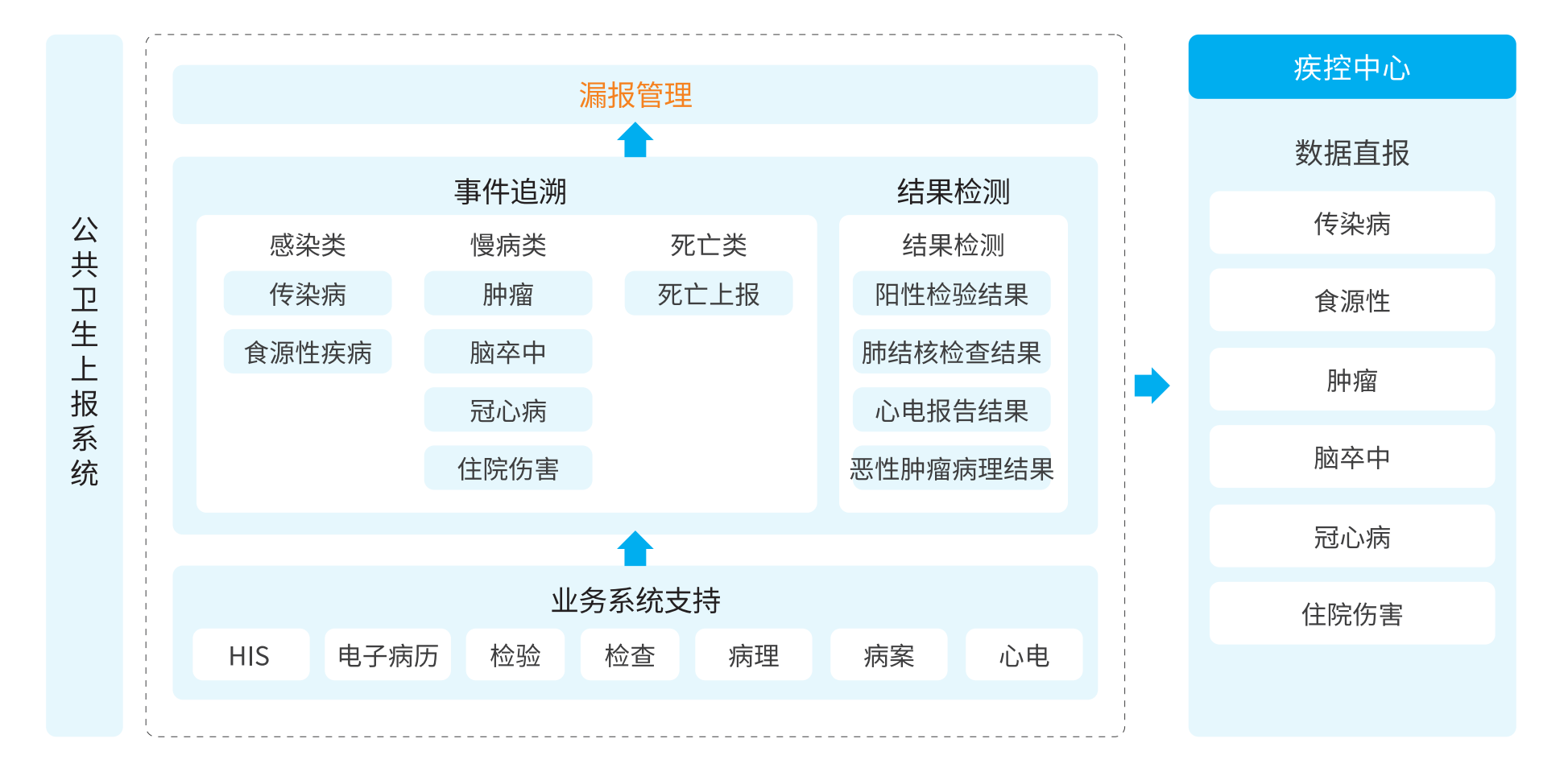 众阳云公共卫生上报系统改变医院公共卫生管理工作中手工上报、统计、查询处理方法,实现实时监控、在线监测、及时报卡、漏报提示、智能处理、自动统计等功能,为医院精细化和实时化管理提供帮助,降低临床科室上报工作量、提高工作效率、有力保障医疗安全。