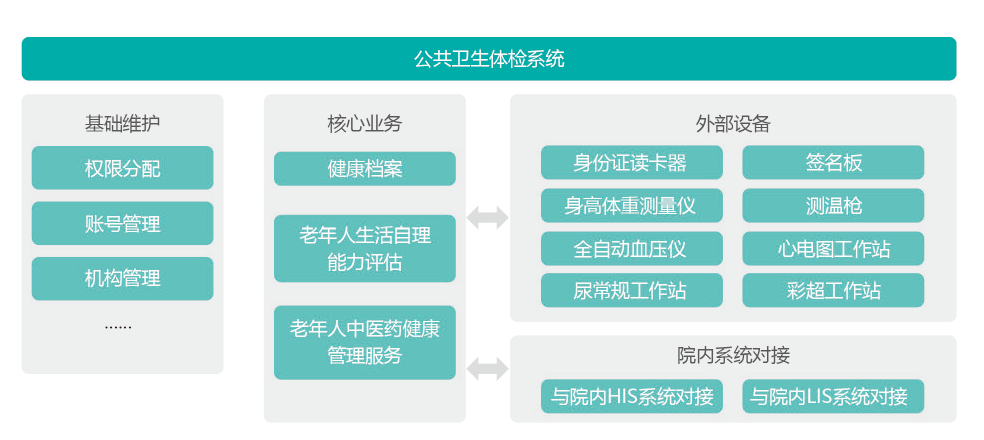 公共卫生体检系统辅助基层医疗人员完成公共卫生服务规范中的老年人体检服务,更好的对辖区内常住居民(居住半年以上的户籍及非户籍居民)进行体检。服务项目包括:血常规、尿常规、肝功、肾功、生化、心电、彩超检查、综合报告以及生化拓展检测项目、自理能力评估、中医体质辨识等。