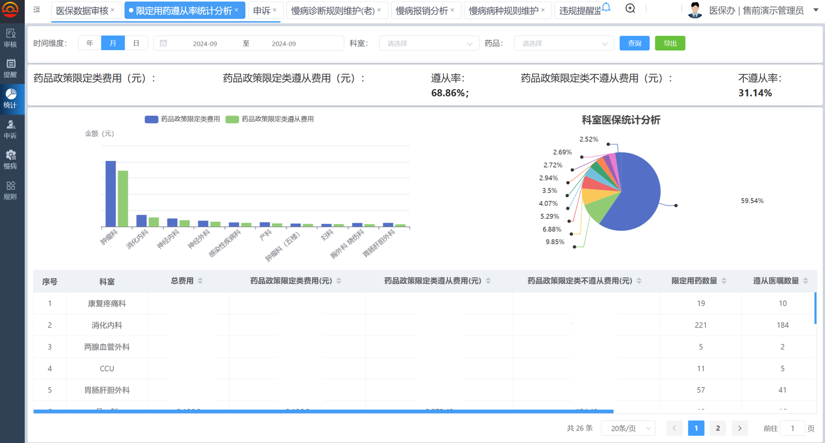 云医保办管理系统围绕慢特病审核、违规申诉、人员备案业务、违规查询、事中审核、医保对账等环节为医院提供医保管理方案。改变了以往医保管理缺乏专业支持、手段单一的事后审核模式,能实现事中控制、事后分析查询的多维度、全过程的监管流程。