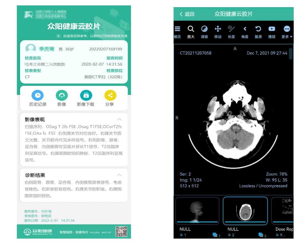 众阳“云胶片”系统是基于移动互联和云储存支撑的一种新的医学影像服务。它能将患者拍摄的医学影像上传至云服务器中,克服了传统胶片的高成本和低传递性,使得医生和患者随时随地通过手机、平板和电脑对影像进行查阅。相比传统胶片的二维图像,“云胶片”还同时具有收放自如、动态展示和三维重建等功能,为医生提供更详细的患者信息,便于精确诊断。